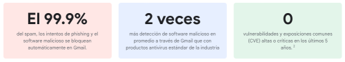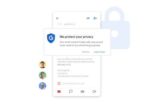Con Gmail, tus datos estarán protegidos, y se mantendrán confidenciales y en regla, gracias a las defensas contra amenazas, la seguridad de nivel empresarial y los controles de privacidad potenciados por IA, y la infraestructura de nube con diseño de seguridad integral de Google.