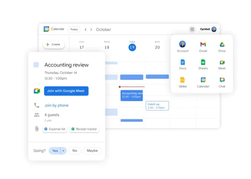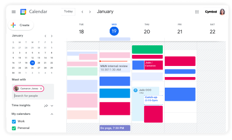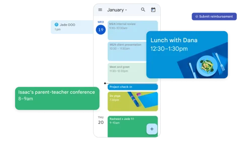 Dedica menos tiempo a la planificación y más a la acción con un calendario que se puede compartir y que funciona en todos los servicios de Google Workspace.