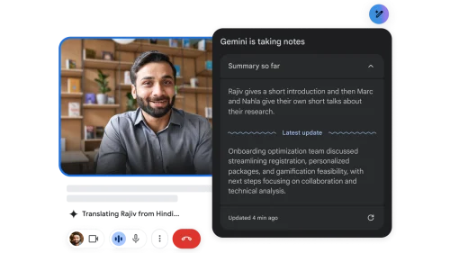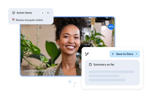 Luce y suena de la mejor manera con las funciones de aspecto, iluminación y sonido de estudio. Conéctate en más de 15 idiomas con la función de subtítulos traducidos. Usa “Toma notas por mí” para los detalles de las reuniones y los elementos de acción (disponible próximamente). Prueba todas estas funciones y muchas más para aprovechar el potencial de la IA generativa con Gemini para Google Workspace.
