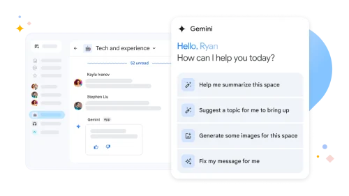 Con Gemini en Chat, tienes un compañero que siempre está preparado para dar respuestas, resumir conversaciones, encontrar archivos en Drive y aportar nuevas ideas creativas.
