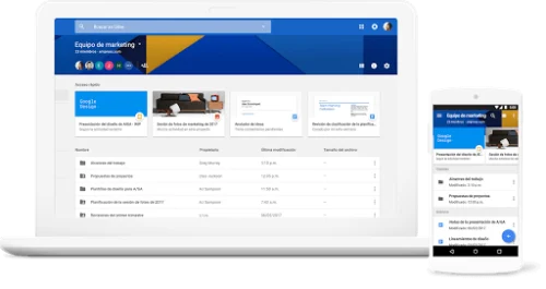 Drive utiliza la IA de Google para predecir y mostrar en tiempo real el contenido que a usted le resulta importante. Drive reconoce a los colaboradores, los eventos y el contenido importante por medio de funciones como Acceso rápido y mejoras de búsqueda basadas en AA a fin de conectar a cada usuario con los archivos que puedan requerir atención.