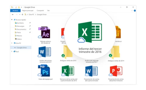 Drive para escritorio le otorga acceso a los archivos directamente desde su computadora, sin que se vea afectado todo el espacio del disco. Pase menos tiempo esperando que se sincronicen los archivos y aumente su productividad.